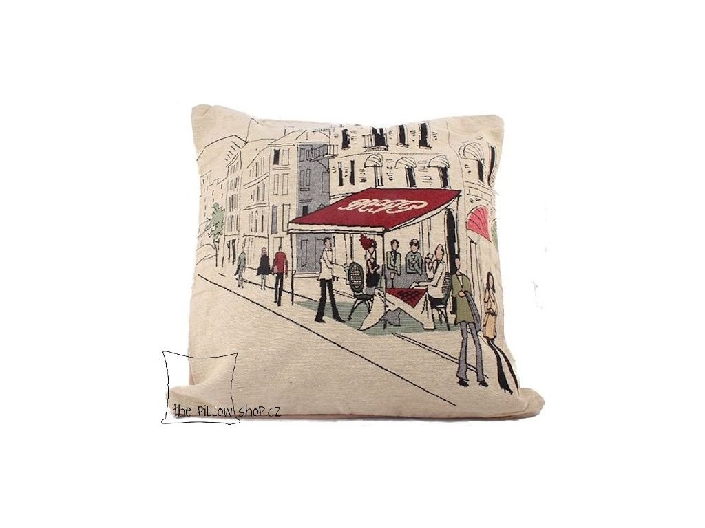 Rozměr polštáře Bistrot je 44 x 44 cm. Polštář má zapínání na zip a zadní stranu jednobarevnou a sametově hebkou. Dekor je pouze na přední straně a je přímo vytkávaný do pevné textilie.
